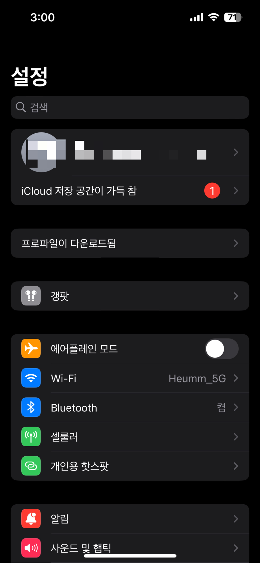 8. 자동으로 프로파일이 다운로드됨이 상단에 뜨게 됩니다.(일반 - VPN 및 기기 관리에서도 확인 가능합니다.)
