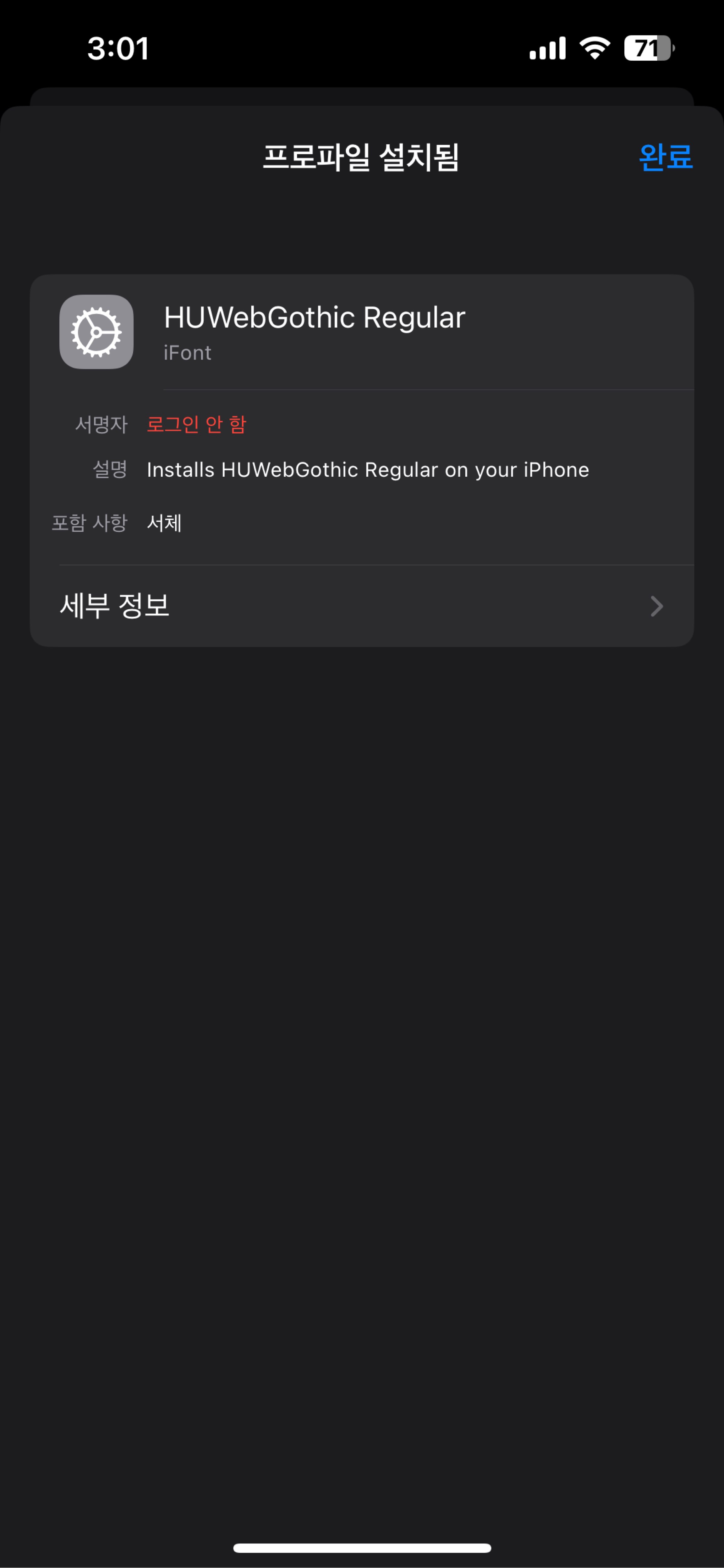 11. 상단에 완료를 누르면 아이폰에 설치는 완료! 카카오톡에 글씨체를 적용해 볼까요?
