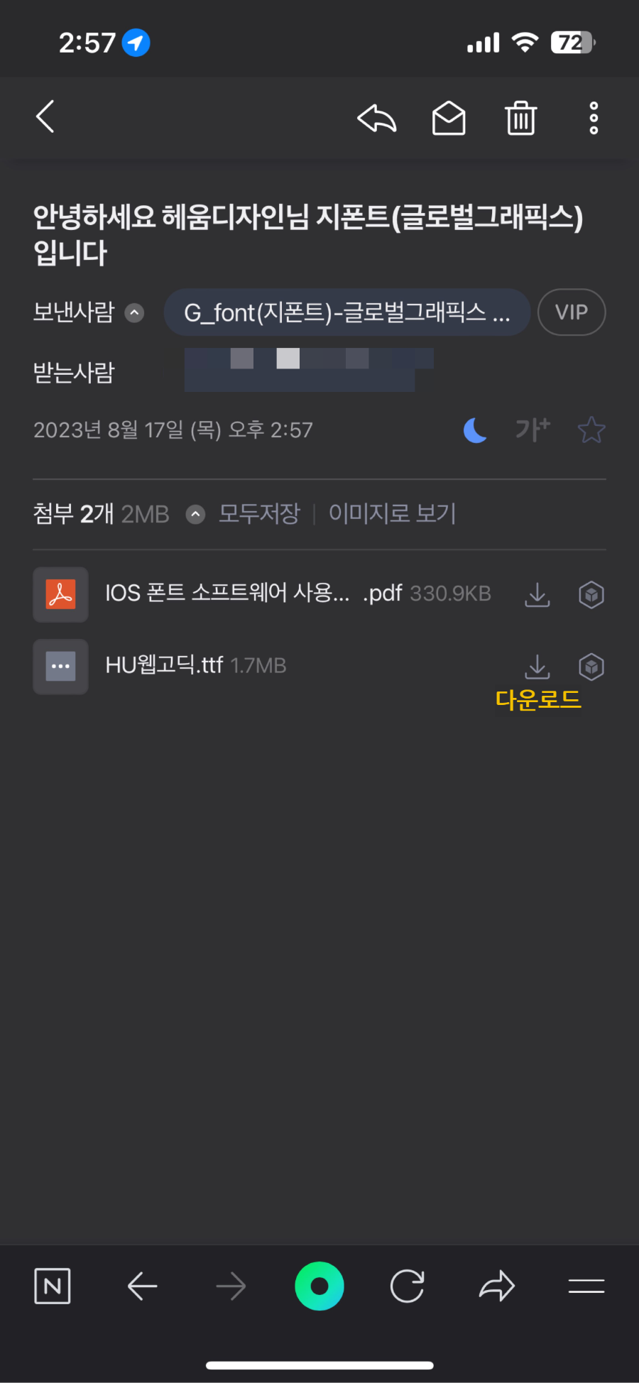 2. 네이버 스마트스토어 지폰트에서 구매한 경우 이메일로 TTF파일을 전달받게 됩니다.